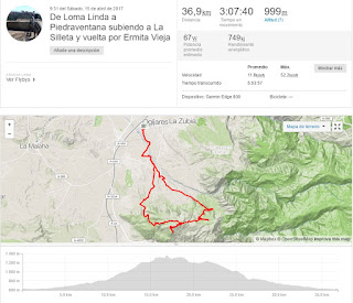 Recorrido seguido: Loma Linda (Ogíjares)-Camino de Gójar-Cuesta Colorada-Cañada Real de Granada a Almuñecar-Otura-Cañada del Juncal-Camino de la Cruz de la Atalaya-Camino del Cortijo de Manar-Loma de las Covazuelas junto al Alto de La Silleta-vértice geodésico de La Silleta-Piedraventana-Sendero de Ermita Vieja por el Puerto de Mala Mujer-Ermita Vieja-Camito de Ermita Vieja-Sendero de Ermita Nueva-Ermita Nueva-Dílar-Cañada Real de Granada a Almuñecar-Loma Linda (Ogíjares).